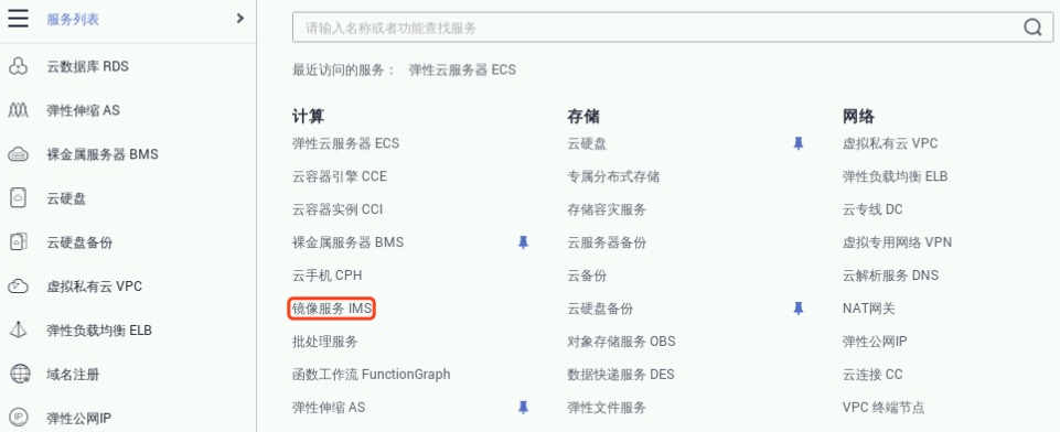 选“控制台”->“服务列表”->“计算”->“镜像服务IMS”,进入“云服务器控制台”,如下