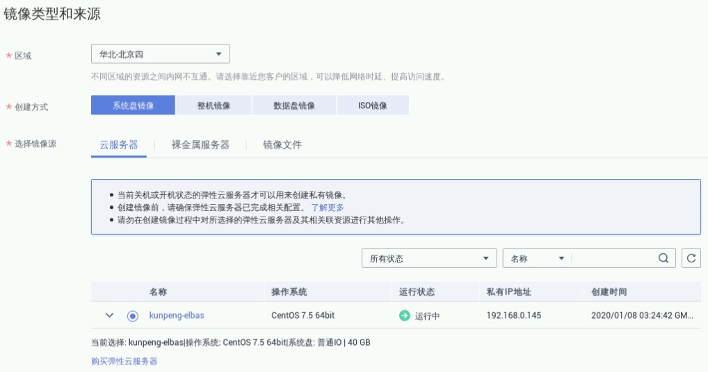 选择镜像源:云服务器,选择预置的云服务器kunpeng-elbas