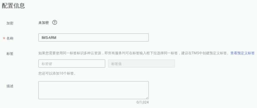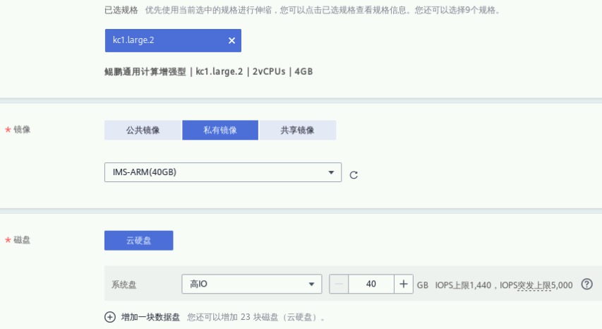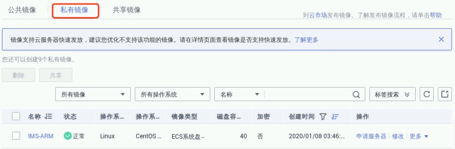 镜像:私有镜像,选择步骤2.2中创建的私有镜像如IMS-ARM,