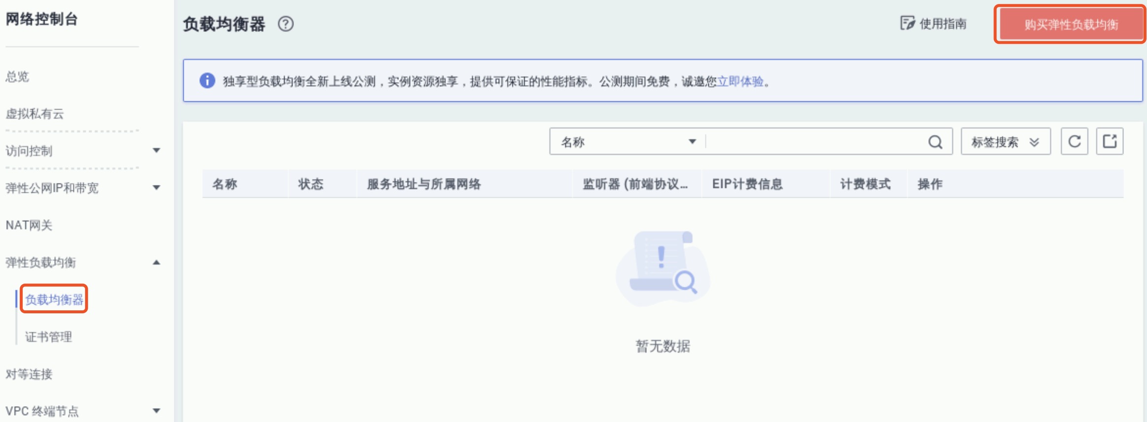 依次选择“控制台”->“服务列表”->“网络”->“弹性负载均衡ELB”,进入负载均衡器管理界面,如下