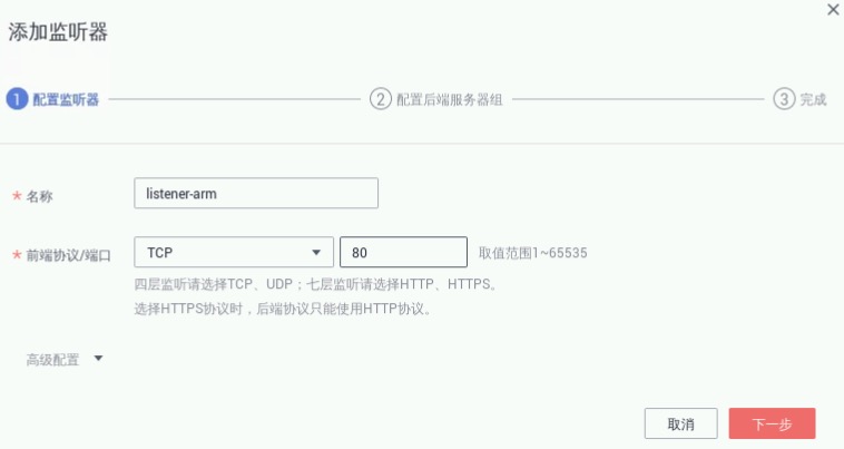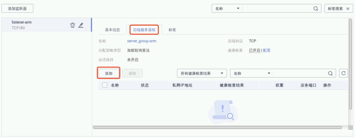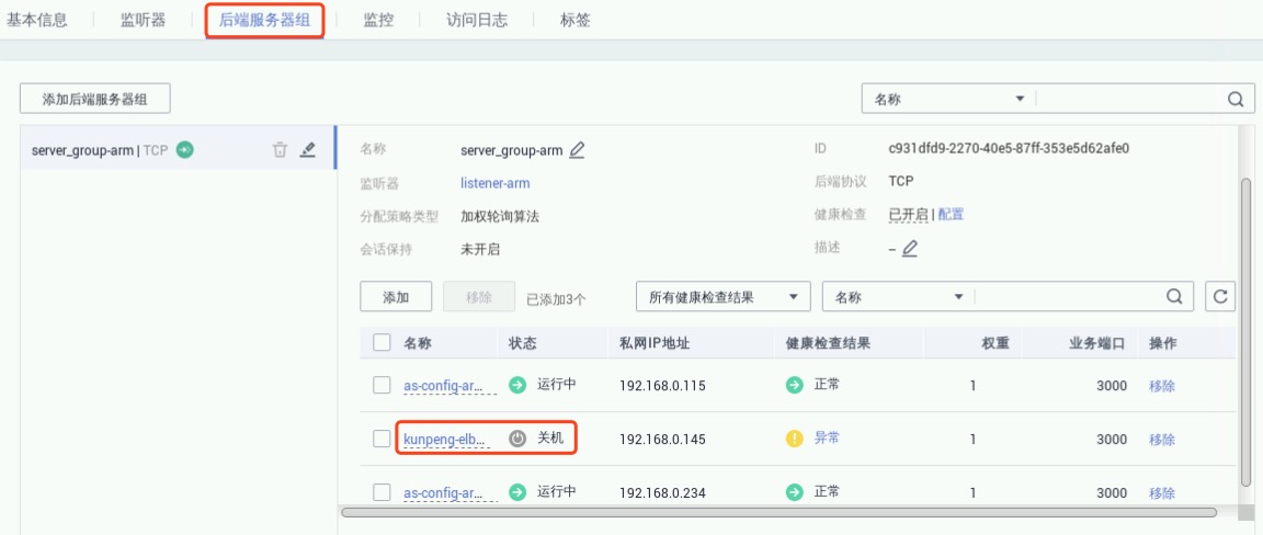 点击“完成”->“确定”。在新添的监听器详情中选择“后端服务器组”,如下