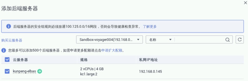 在弹出的“添加后端服务器”窗口中,选择预置的ECS服务器“kunpeng-elbas”,点击“下一步”,如下