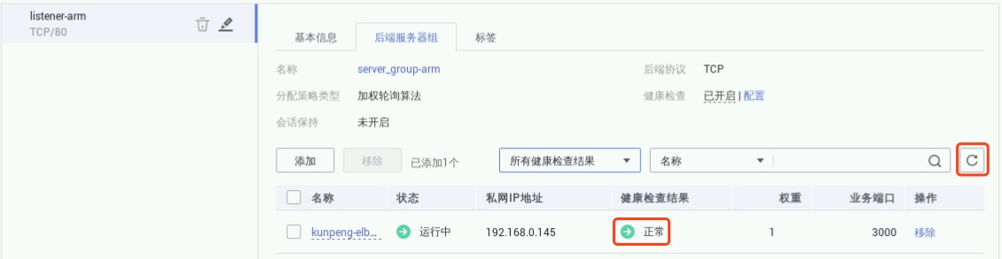 此时再次访问步骤3.2记录的公网IP依然成功,并且进入步骤3.1购买的增强型负载均衡(“控制台”->“服务列表”->“网络”->“弹性负载均衡ELB”)的详情页,在后端服务器组可以看到:预置的kunpeng-elbas云主机的“健康检查结果”为异常状态,另外还有两个服务器是正常状态。项目还能通过负载均衡服务正常访问就在此,如下