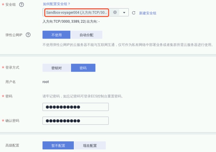 安全组:选择预置的以账户名命名的安全组,