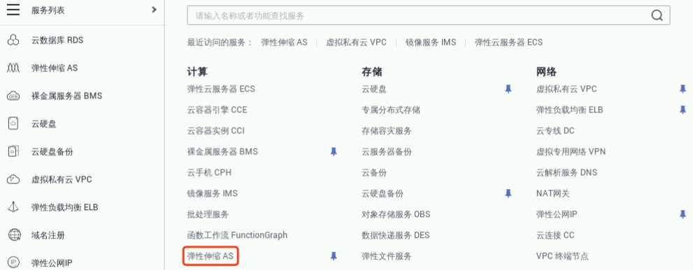 依次选择“控制台”->“服务列表”->“计算”->“弹性伸缩AS”,进入“伸缩实例”界面。如下