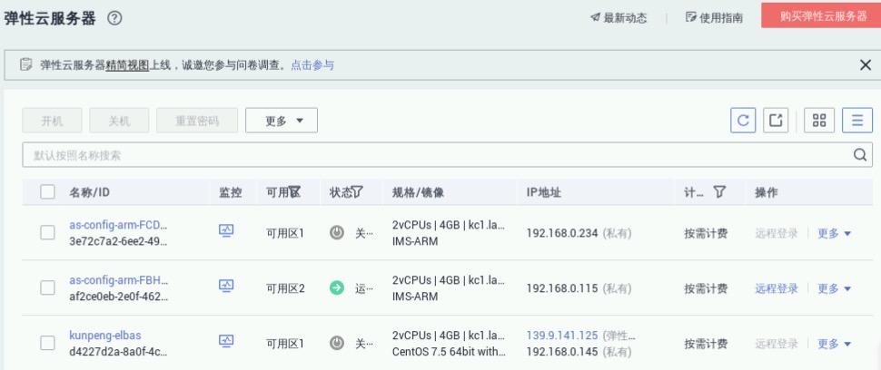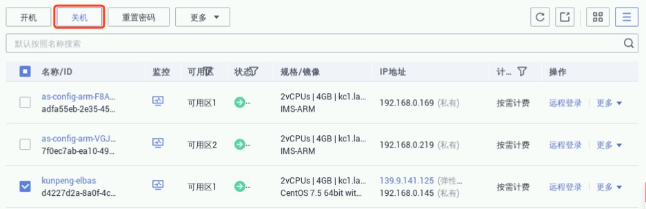 依次选择“控制台”->“服务列表”->“计算”->“弹性云服务器ECS”,进入弹性云服务器管理界面,勾选预置的kunpeng-elbas服务器,点击“关机”,如下