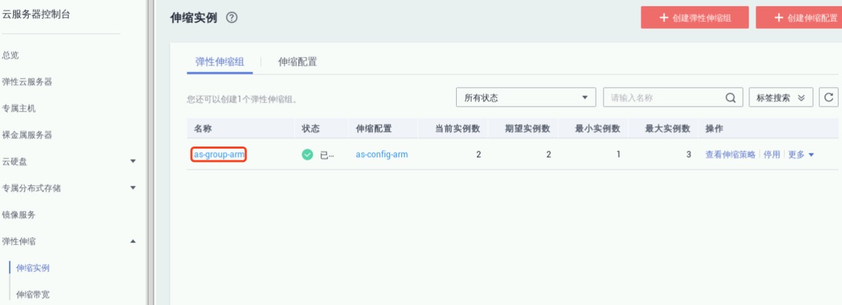 依次选择“控制台”->“服务列表”->“计算”->“弹性伸缩AS”,进入弹性伸缩管理界面。点击步骤4.3创建的弹性伸缩组名称进入详情,如下