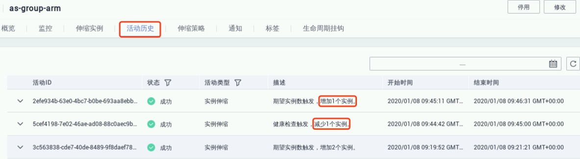 注:伸缩事件的触发时间可能较长,请用户耐心等待(大约5分钟)