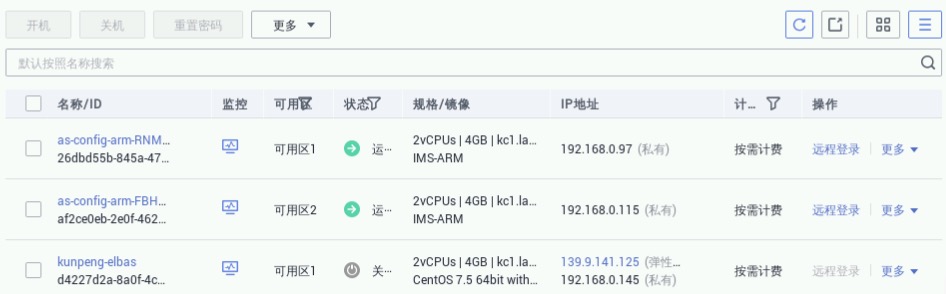 依次选择“控制台”->“服务列表”->“计算”->“弹性云服务器ECS”,进入弹性云服务器管理界面查看云服务器列表,发现伸缩创建的云主机全部为开机状态,如