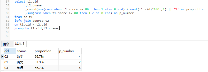 1 、统计各科成绩 >=70 de 人数:课程编号,课程名称, 人数及所占百分比 5