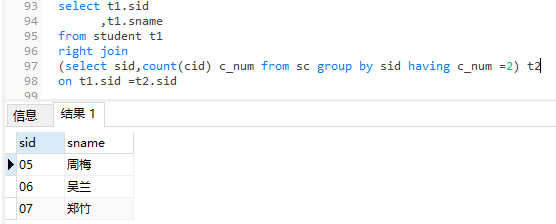 4、查询出只选修两门课程的学生学号和姓名