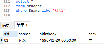 6、查询名字中含有「风」字的学生信息