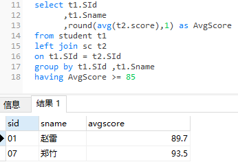 10、查询平均成绩大于等于 85 的所有学生的学号、姓名和平均成绩