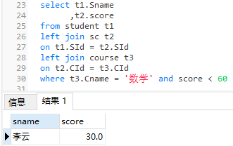 11 、查询课程名称为「数学」,且分数低于 60 的学生姓名和分数 8