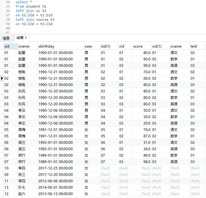 12、查询所有学生的课程及分数情况(存在学生没成绩,没选课的情况)