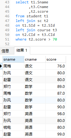 13 、查询任何一门课程成绩在 70 分以上的姓名、课程名称和分数 10