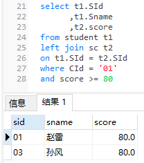 15、查询课程编号为 01 且课程成绩在 80(含80) 分以上的学生的学号和姓名