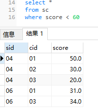 14、查询不及格的课程