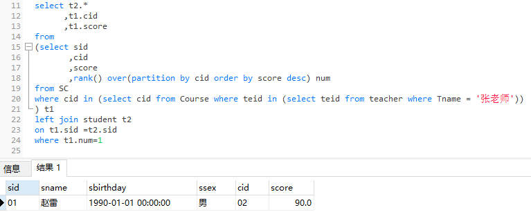 17 、查询选修「张老师」所授课程的学生中,成绩最高的学生信息及其成绩 11