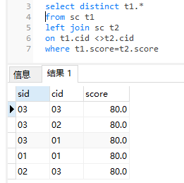 18、查询不同课程 但成绩相同的 学生的学生编号、课程编号、学生成绩