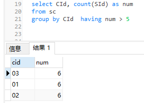 20、统计每门课程的学生选修人数(超过 5 人的课程才统计)
