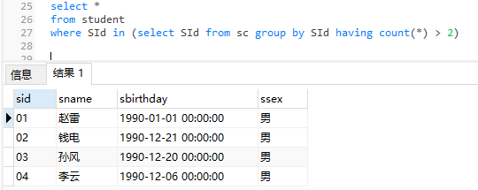 21、检索至少选修三门课程的学生的学生信息