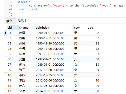 insert into Student values('13' , '孙七' , date '2014-06-01' , '女');