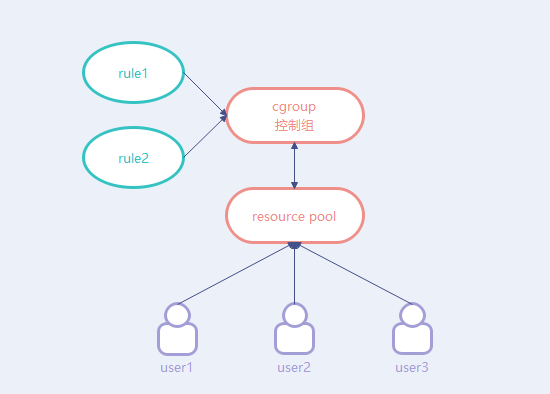 上图意思为,配置规则,要关联到控制组,控制组与资源池一一对应关联。之后将用户关联到资源池。最终就实现了用户受到规则限制的关系。