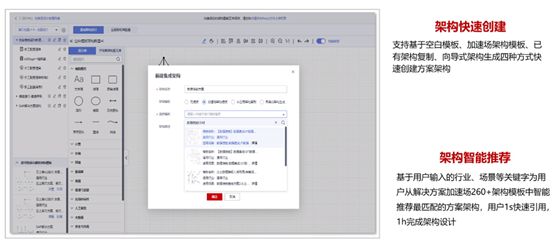 - 基于用户输入的行业、场景等关键字为用户从解决方案加速场260+架构模板中智能推荐最匹配的方案架构,用户1s快速引用,1h完成架构设计;