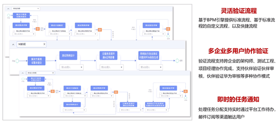 - 验证流程支持跨企业的架构师、测试工程协作完成,支持伙伴验证伙伴审核,伙伴验证华为审核等多种协议模式