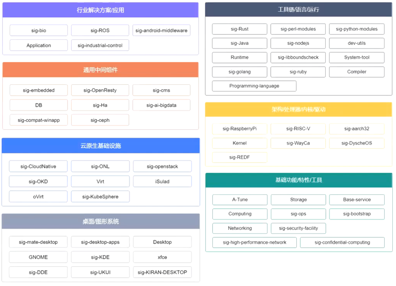 行业解决方案/应用、工具链/语言运行、通用中间组件、架构/处理器/内核驱动、云原生基础设施、基础功能特性工具、桌面/图形系统