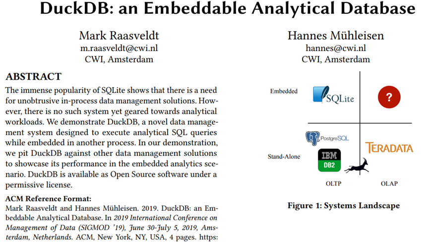 第一次对DuckDB有印象是分析SIGMOD2019年的论文,DuckDB 有4页的pdf文档介绍: