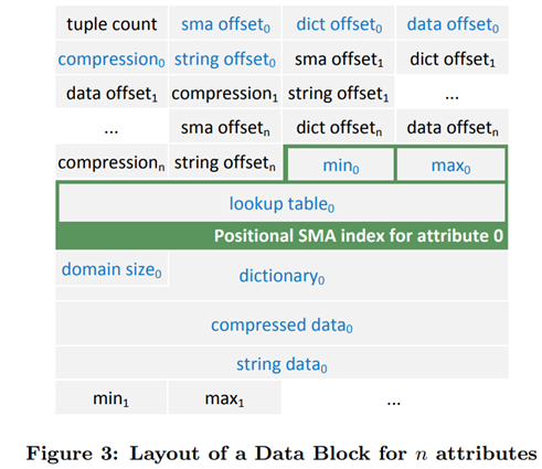 逻辑表被水平分为列的多个数据块,物理上支持轻量级的压缩,数据块只是携带每个列的最大徐晓索引,以方便决定数据块与查询是否相关。另外,针对每列,数据块通过轻量级的索引来限制数据扫描的数量。