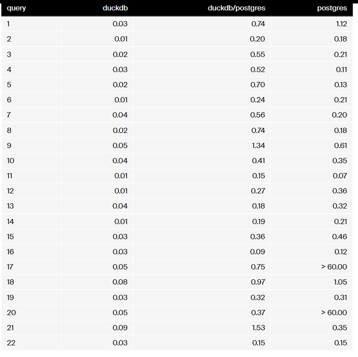 同时,PostgreSQL也可以通过duckdb_fdw来访问DuckDB中的数据,详细测试用例,请参考德哥的博文:用duckdb_fdw加速PostgreSQL分析计算, 提速40倍, 真香