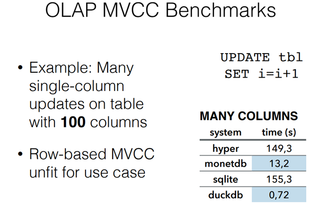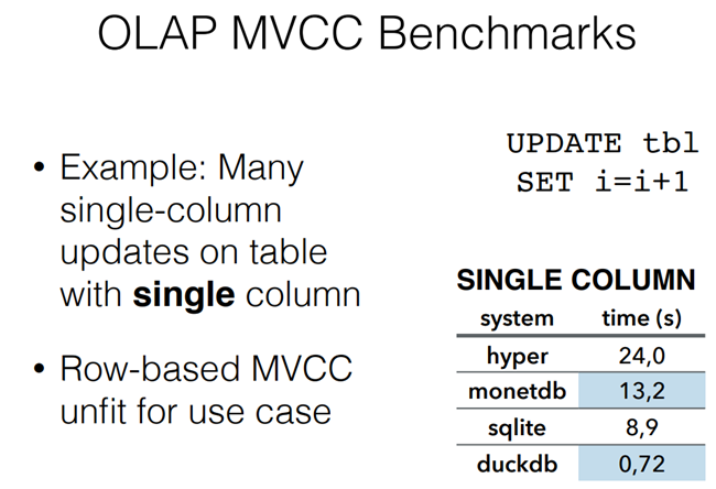 DuckDB通过MVCC来提供ACID兼容性。MVCC是基于HyPer的MVCC机制来实现的,HyPer支持OLAP/OLTP混合模式。DuckDB的MVCC支持原地更新(updates data in-place),旧的数据保存在undo缓存中。采用MVCC而没有采用OCC(Optimistic Concurrency Control),主要是考虑后续DuckDB的并发更新的场景。
