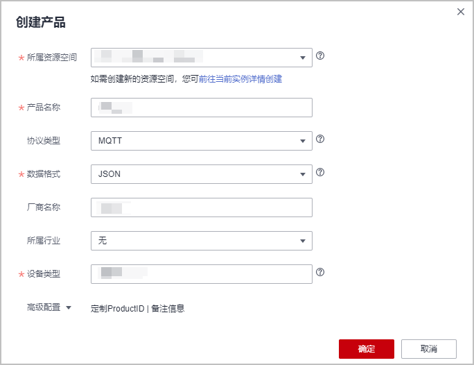 步骤 %7 单击右上角的“创建产品”,创建一个基于MQTT协议的产品,填写参数后,单击“确认”。