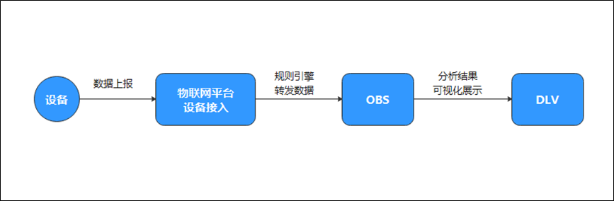 设备上报数据到物联网平台,物联网平台将数据以CSV格式存储到对象存储服务(OBS),数据可视化服务(DLV)从OBS文件读取数据并展现为多个维度的报表。
