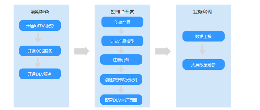 华为云物联网平台提供规则引擎能力,支持将设备上报的数据转发至华为云其他云服务,可实现将海量数据通过对象存储服务(OBS)存储,再由数据可视化服务(DLV)读取数据呈现为可视化报表,实现数据的一站式采集、处理和分析。