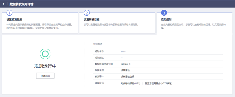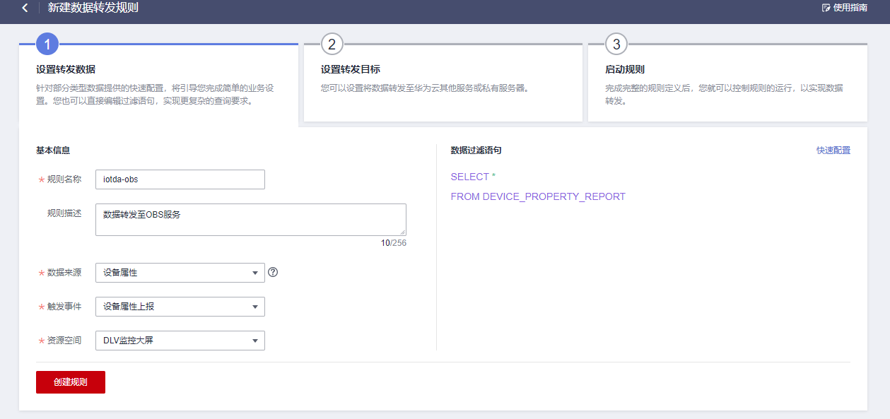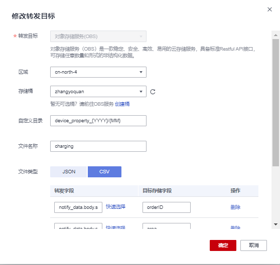 2. 创建数据转发规则,将数据以CSV格式持久化至OBS服务。