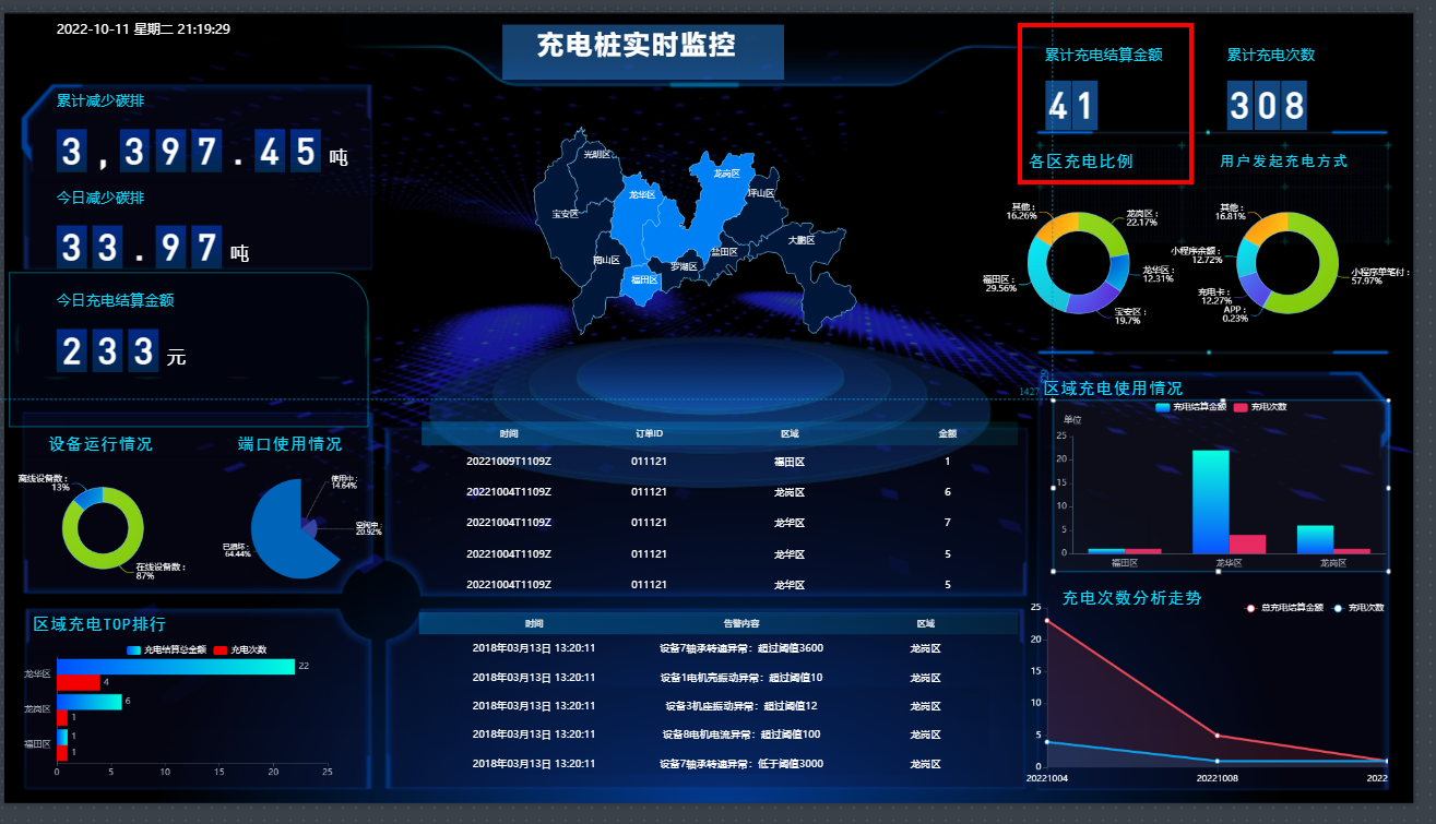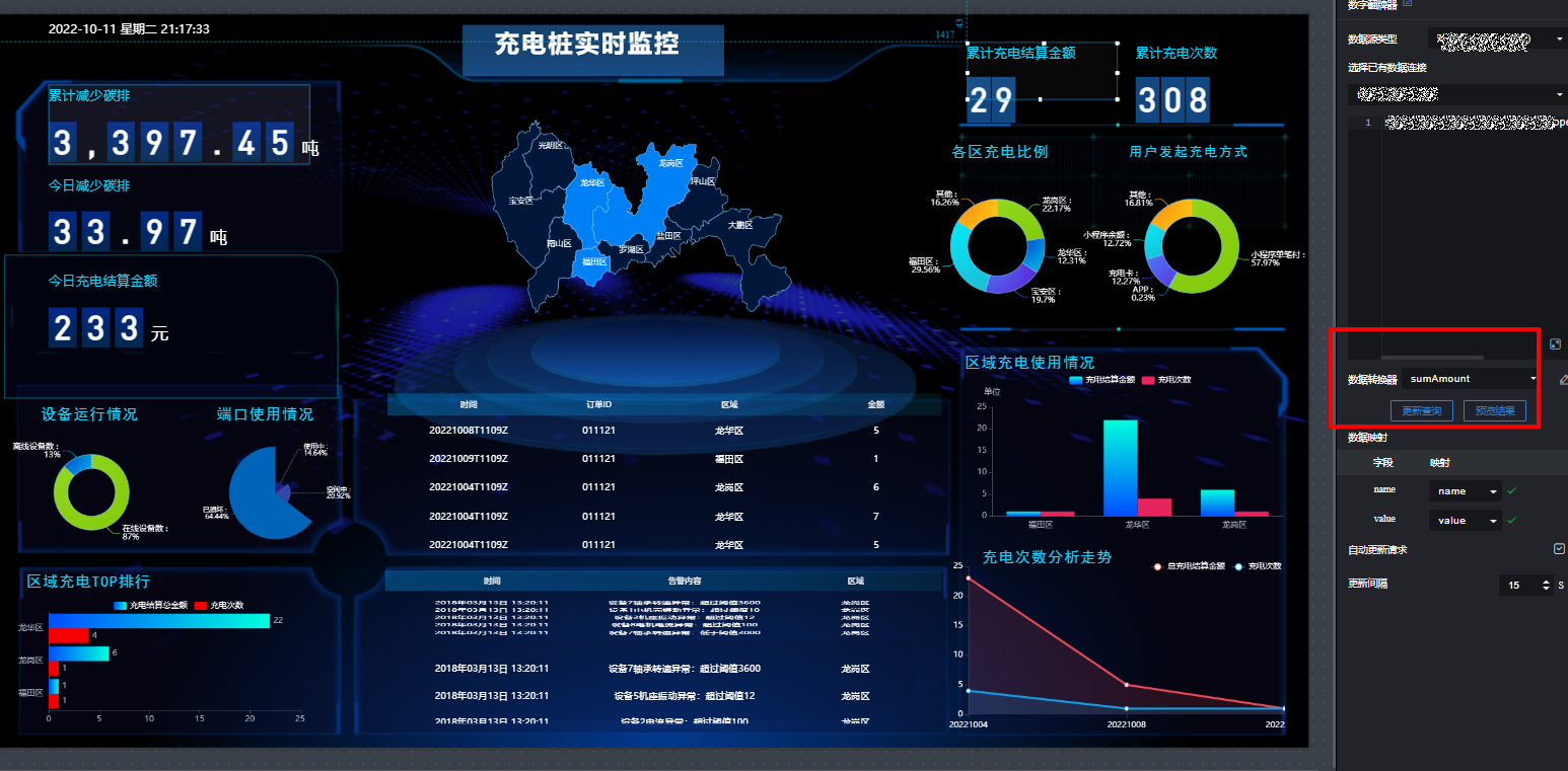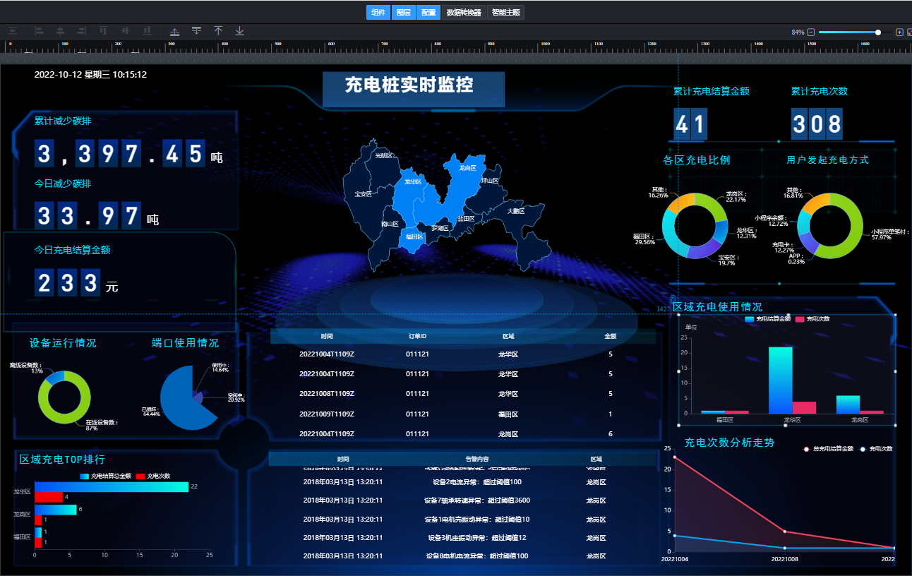 步骤 %7 访问DLV控制台“我的大屏”页面,新建大屏添加并编辑组件实现下图效果(参考:创建大屏 、编辑大屏 )。也可以通过附件导入大屏(具体操作步骤请参考:导入导出大屏 ,附件:充电桩 监控大屏展示 )。