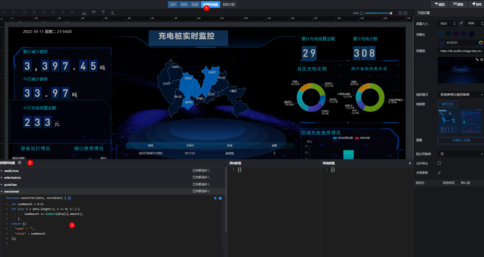 步骤 %7 选择组件,更改数据转换器为“sumAmount“,点击“更新查询“,就可以看到数据刷新到组件。(这样“订单金额“组件就完成开发,按照这个方法即可完成其他组件的开发。)