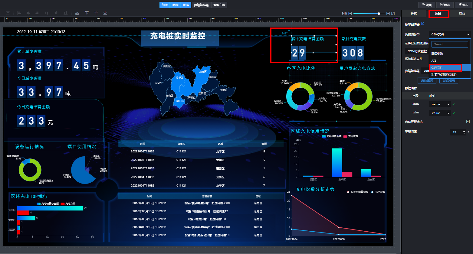 步骤 %7 选中”累计充电金额”对应的数字翻牌组件,在右侧属性窗口,切换到”数据”页签,选择数据源类型为“CSV”。