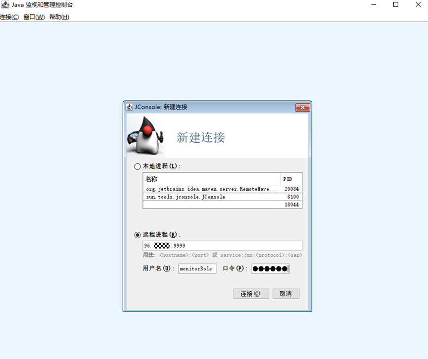建立远程JMX连接,输入Tomcat进程的IP地址及配置的JMX端口,输入用户名及密码。