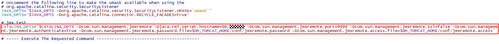 CATALINA_OPTS="$CATALINA_OPTS -Dcom.sun.management.jmxremote -Djava.rmi.server.hostname=xx.xx.x.xx -Dcom.sun.management.jmxremote.port=9999 -Dcom.sun.management.jmxremote.ssl=false -Dcom.sun.management.jmxremote.authenticate=true -Dcom.sun.management.jmxremote.password.file=$OM_TOMCAT_HOME/conf/jmxremote.password -Dcom.sun.management.jmxremote.access.file=$OM_TOMCAT_HOME/conf/jmxremote.access"