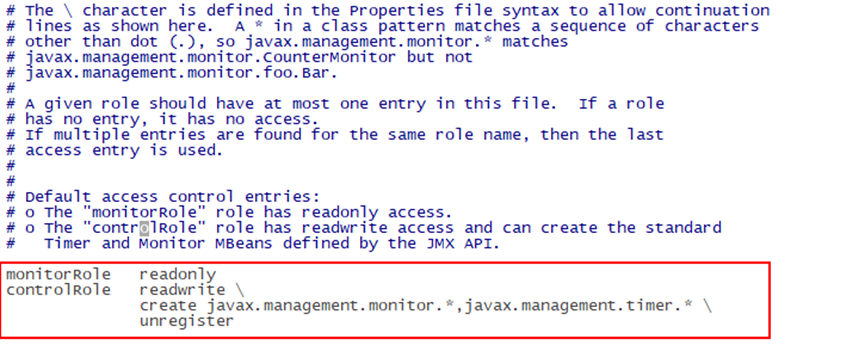 jmxremote.access文件内容如下, monitorRole为只读角色,controllRole为高级角色,具有读写权限。