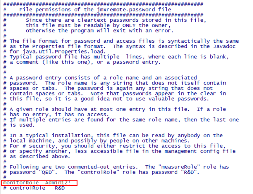 jmxremote.password文件内容如下,monitorRole的密码设置为Admin12!。