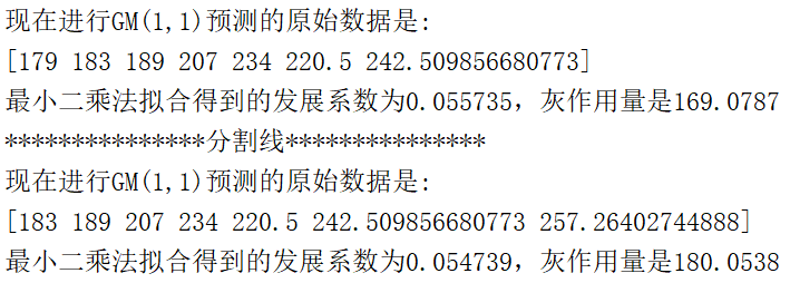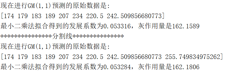代码中:当数据量大于4时,我们利用试验组来选择使用传统的GM(1,1)模型、新信息GM(1,1)模型还是新陈代谢GM(1,1)模型; 如果数据量等于4,那么我们直接对三种方法求一个平均来进行预测
