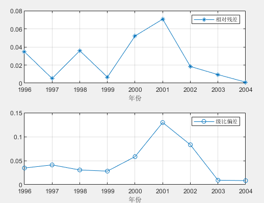 如图所示:我们认为平均相对残差和平均级比偏差数值越小越好,一般以0.1作为评判标准,例如这样,我们称此模型对原数据拟合的不错